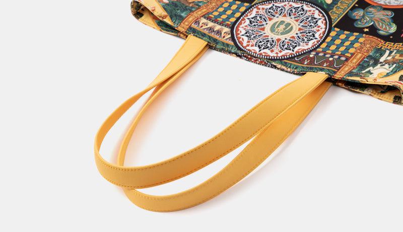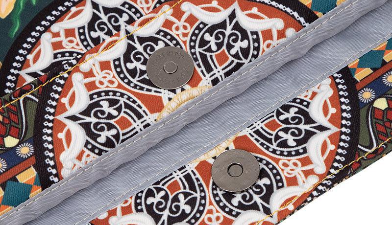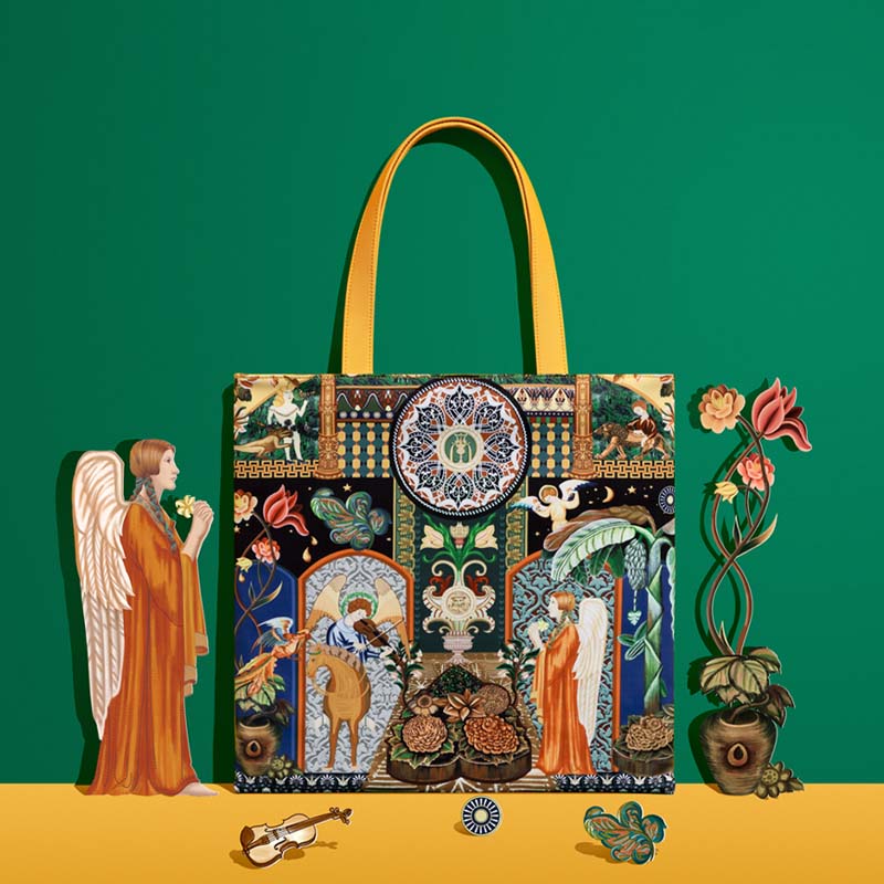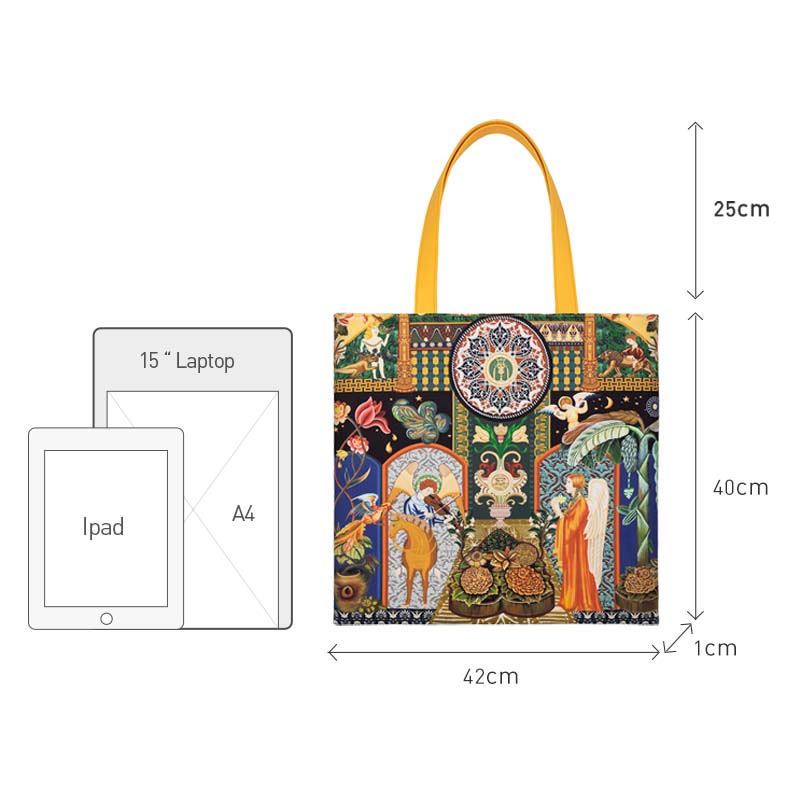 Imprimé avec un design riche et détaillé, ce sac présente des anges gracieux au milieu d'un jardin paradisiaque, entourés de motifs floraux et de créatures mythologiques. Ce sac est bien plus qu'un simple accessoire – c'est une invitation à un voyage fantastique et spirituel.