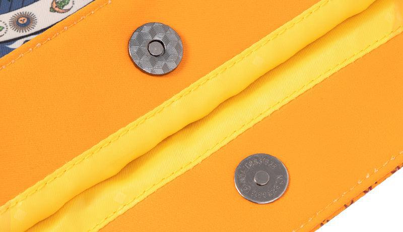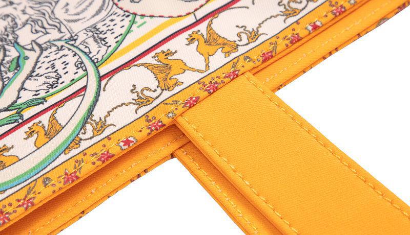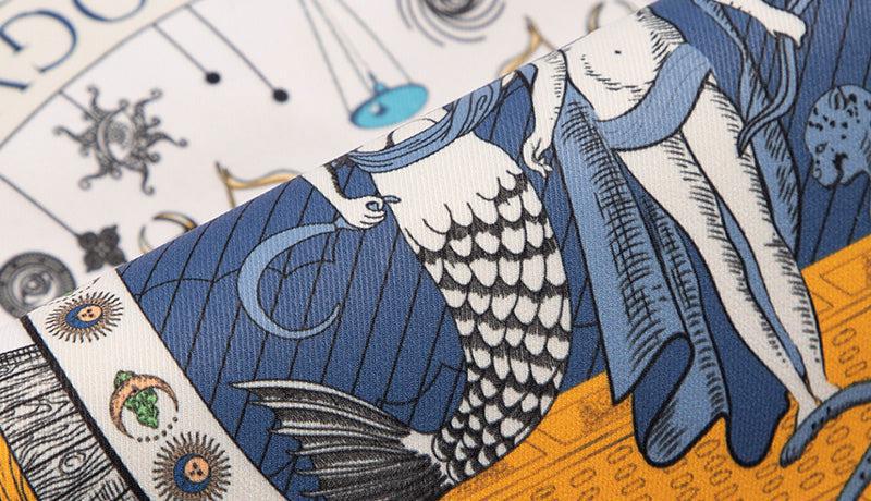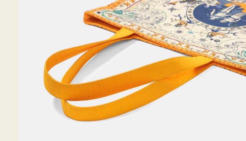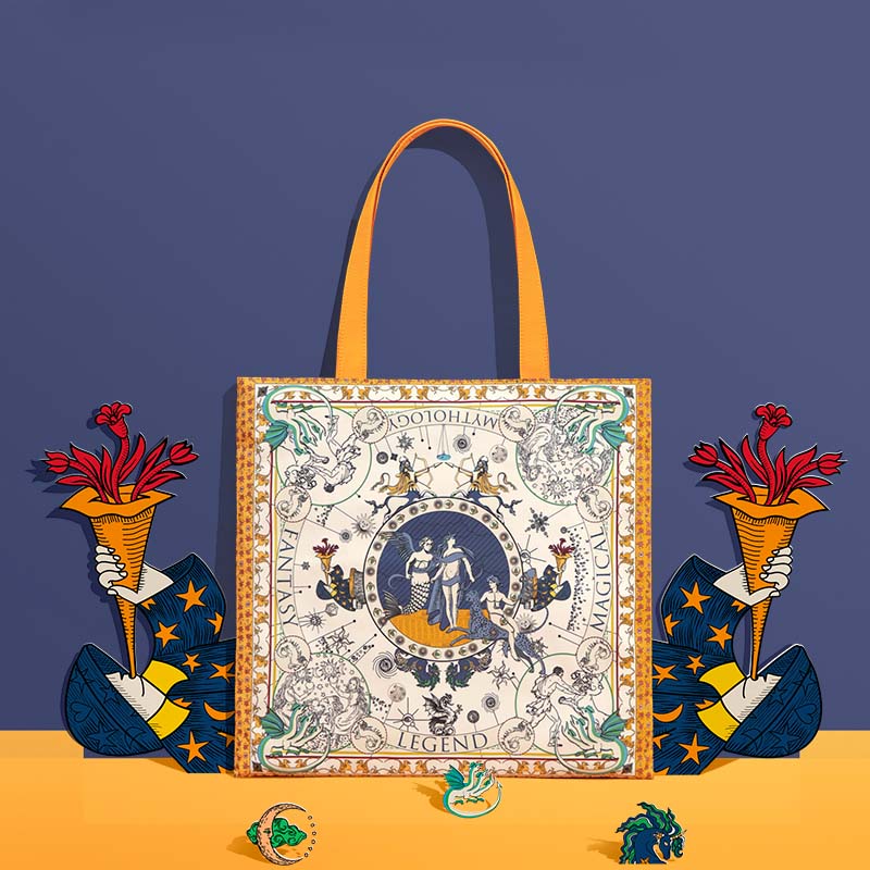Autour d'eux, des motifs astrologiques et des créatures légendaires ajoutent une dimension mystique, tandis que des symboles cosmiques et des éléments naturels complètent cette illustration détaillée et riche. Ce sac est bien plus qu'un simple accessoire – c'est une œuvre d'art qui évoque un voyage à travers les mythes et la magie.