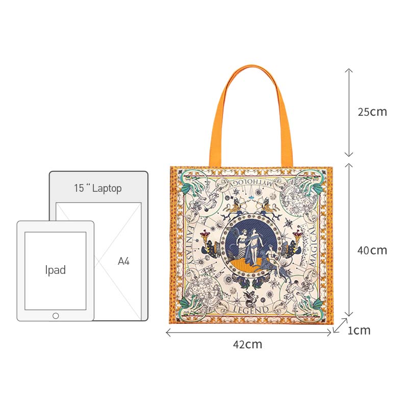 Imprimé avec un design riche et détaillé, ce sac met en scène des figures mythologiques, des créatures fantastiques et des motifs cosmiques. Ce sac est bien plus qu'un simple accessoire – c'est une déclaration artistique et une invitation à un voyage dans un monde légendaire.
