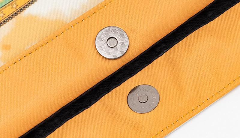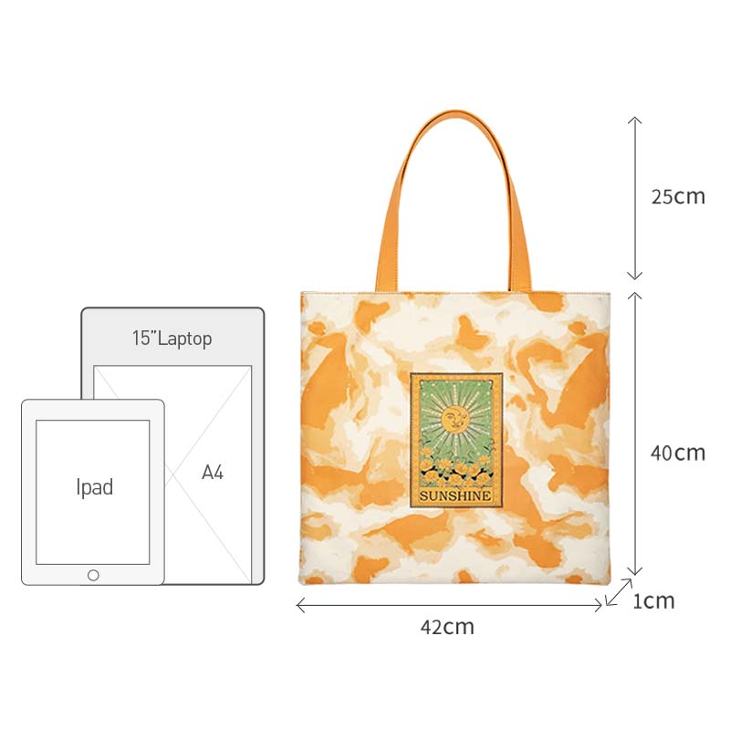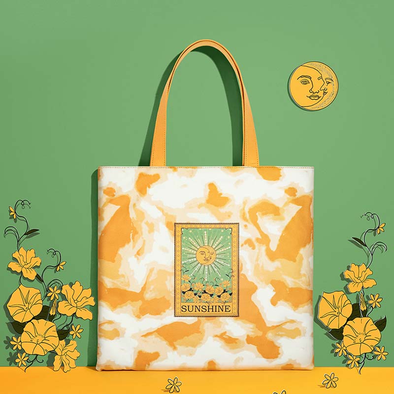 Imprimé avec un design vibrant et détaillé, ce sac met en scène un soleil radieux entouré de fleurs luxuriantes et de motifs étoilés. Chaque détail, des rayons lumineux aux couleurs chaudes de l'arrière-plan, évoque une ambiance de bonheur et de sérénité. Ce sac est bien plus qu'un simple accessoire – c'est une déclaration artistique et une invitation à porter l'éclat du soleil avec vous partout où vous allez.
