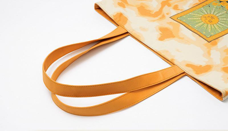 Autour de cette scène centrale, des motifs étoilés et des couleurs chaudes d'orange et de crème créent une ambiance accueillante et apaisante. Ce sac est bien plus qu'un simple accessoire – c'est une œuvre d'art qui apporte une touche de lumière et de bonheur à votre quotidien.