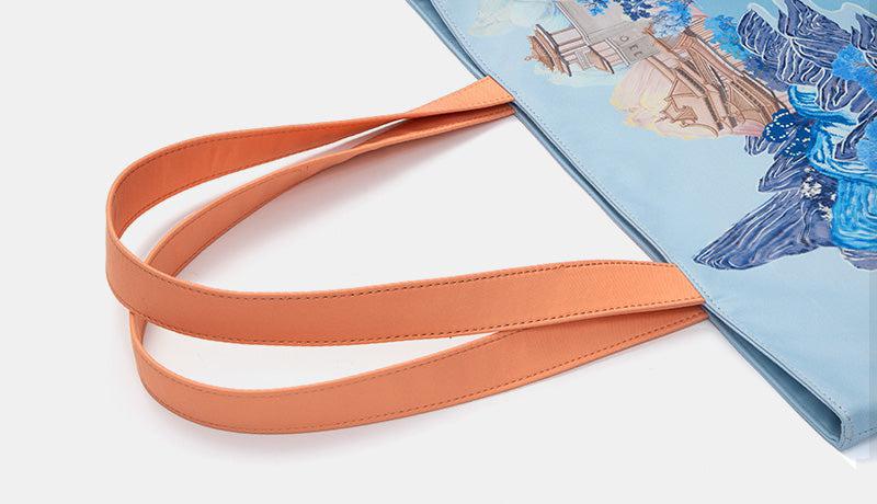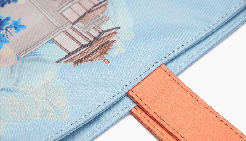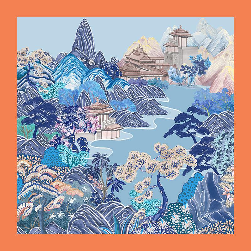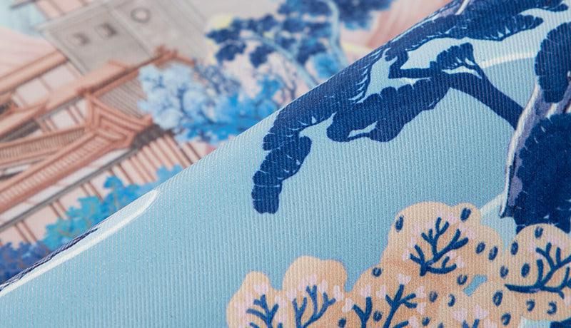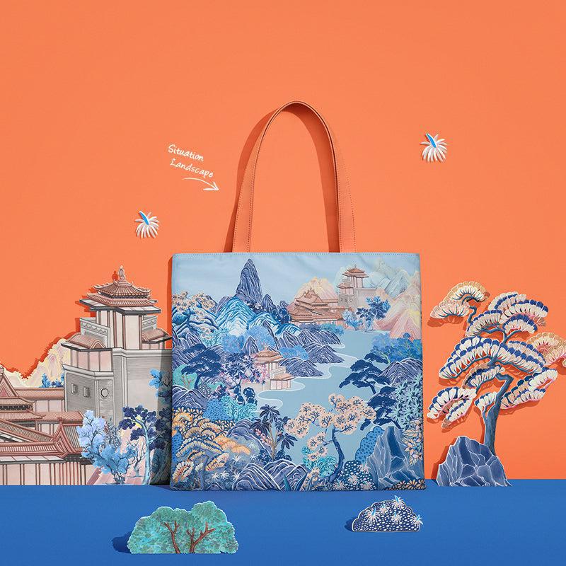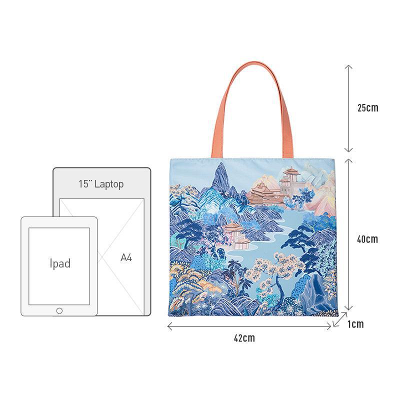 Le design de ce cabas est une immersion dans un paysage serein et élégant inspiré des traditions asiatiques. Au centre, des temples majestueux sont entourés de montagnes colorées et de végétation luxuriante.