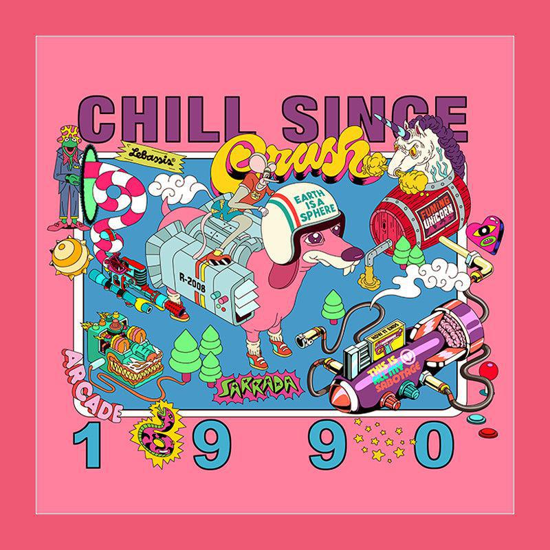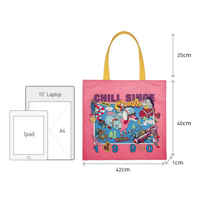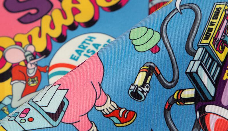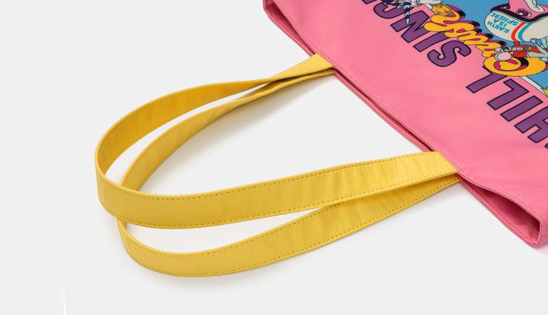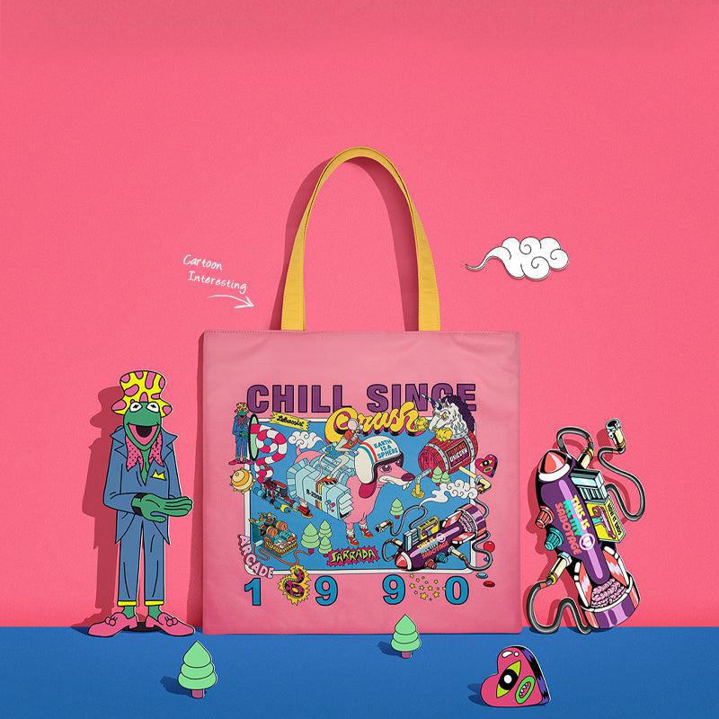 Le design de ce cabas est une plongée ludique et colorée dans l'univers nostalgique des années 90. Au centre, un chien rose portant une casquette 'Earth is a Sphere' est entouré de personnages et d'éléments fantaisistes et futuristes.