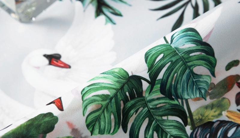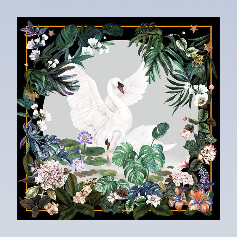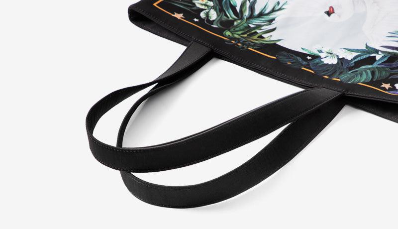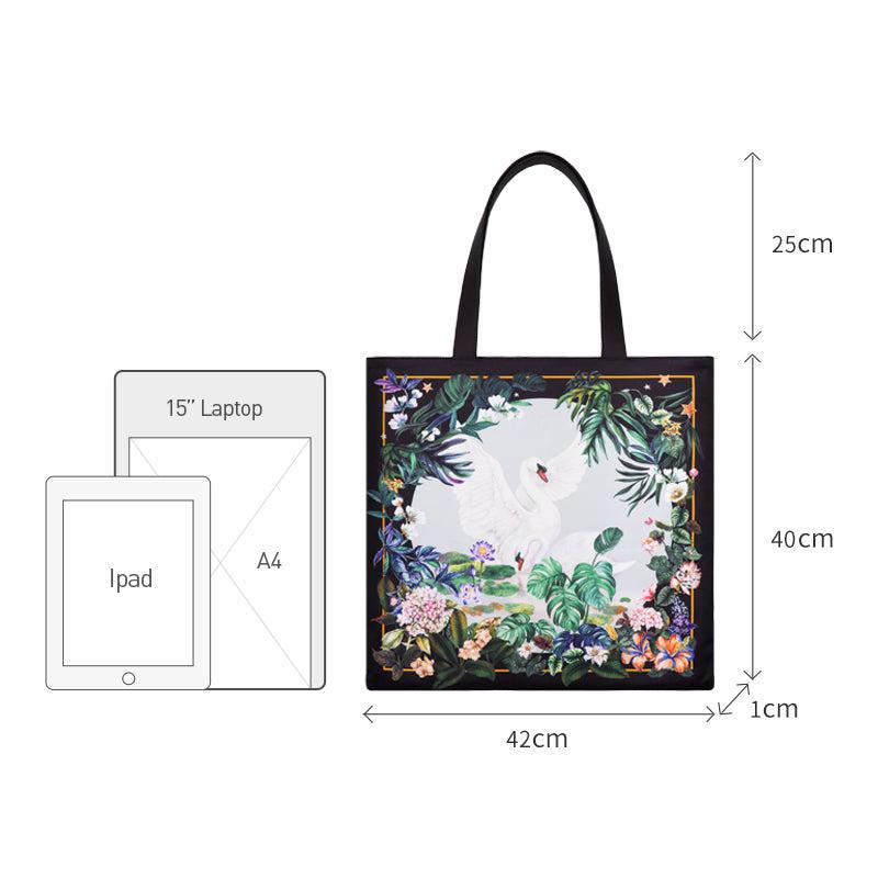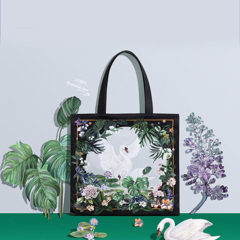 Imprimé avec un design détaillé et apaisant, ce sac met en scène deux cygnes majestueux entourés de fleurs luxuriantes et de feuillages exotiques. Ce sac est bien plus qu'un simple accessoire – c'est une déclaration artistique et une invitation à embrasser la beauté naturelle avec élégance.