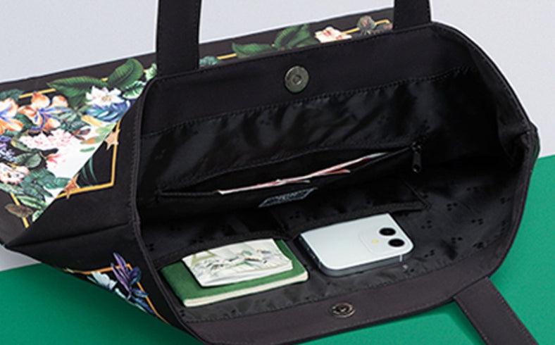 Autour d'eux, des fleurs luxuriantes et des feuillages exotiques encadrent la scène, ajoutant une touche de couleur et de vitalité. Ce sac est bien plus qu'un simple accessoire – c'est une œuvre d'art qui apporte une touche de nature élégante et apaisante à votre quotidien.