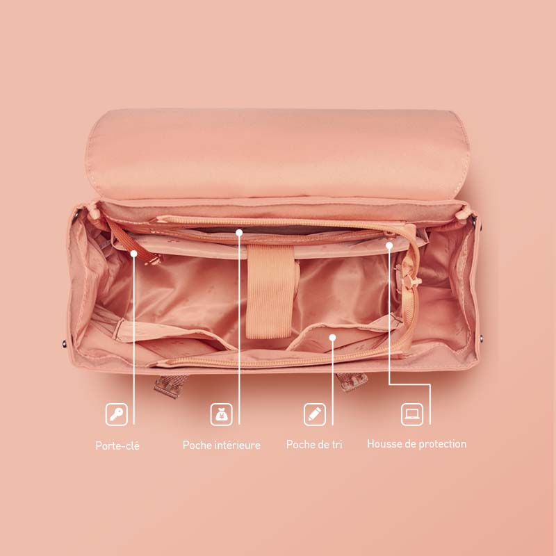 Depuis que j'ai des enfants, les sacs à dos ont remplacé le sac à main. Celui-ci vient a une grande pochette séparée en deux espaces de taille A4. Et peut contenir un ordinateur portable ou une tablette grâce à sa pochette rembourrée. Je le trouve très bien pensé car il a plusieurs petits compartiments. Moi j'adore son design et ses couleurs !