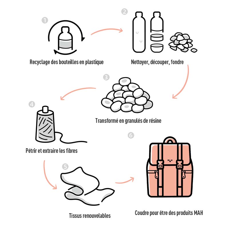Les bouteilles sont d’abord nettoyées, découpées et fondues en granulés de résine. Ces granulés sont ensuite pétris pour extraire les fibres, qui sont tissées en tissus renouvelables. Enfin, ces tissus sont utilisés pour confectionner nos sacs élégants et écologiques.