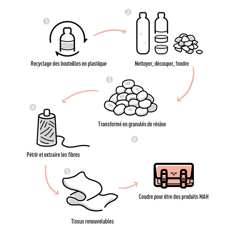 Les bouteilles sont d’abord nettoyées, découpées et fondues en granulés de résine. Ces granulés sont ensuite pétris pour extraire les fibres, qui sont tissées en tissus renouvelables. Enfin, ces tissus sont utilisés pour confectionner nos sacs élégants et écologiques.