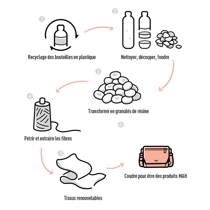 Les bouteilles sont d’abord nettoyées, découpées et fondues en granulés de résine. Ces granulés sont ensuite pétris pour extraire les fibres, qui sont tissées en tissus renouvelables. Enfin, ces tissus sont utilisés pour confectionner nos sacs élégants et écologiques.