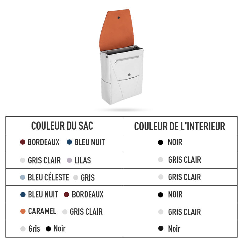 MaH Young duo est disponible en plusieurs coloris. Référez-vous à ce guide pour apprendre plus sur les couleurs extérieures et intérieures du sac.