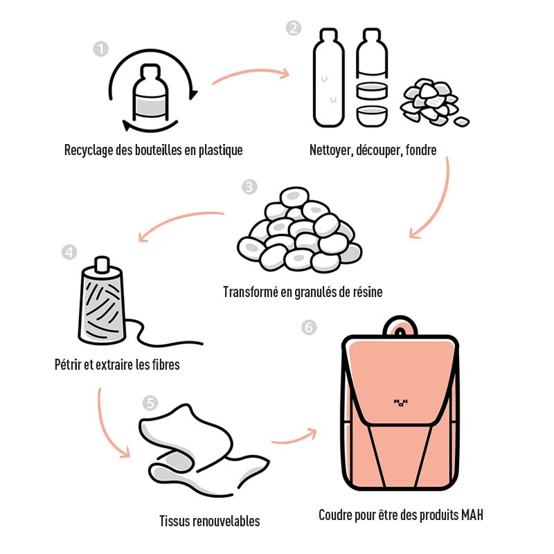 Pour fabriquer nos sacs MaH Rose Glacier, nous utilisons les plus grands standards de fabrication de tissu recyclé, tels que Repreve©. Ce processus de recyclage innovant permet d’économiser jusqu’à 80% d’énergie et de préserver 1 tonne d’eau, tout en réduisant significativement la pollution plastique.